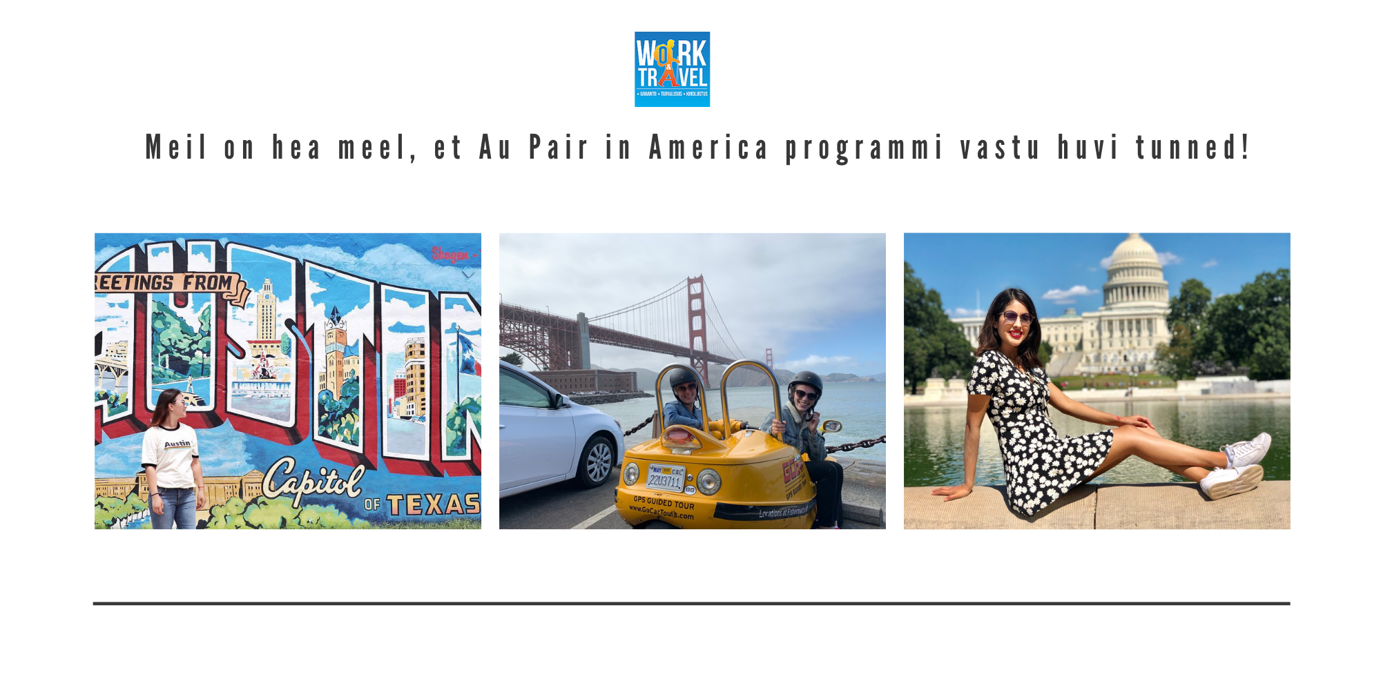 Meie ettevõtte eesmärk on aidata noortel elada ja töötada välismaal kasutades selleks erinevate rahvusvaheliste programmide tuge. Work & Travel on ametlik Au Pair in America ja Camp America esindaja Eestis, Lätis ja Venemaal.